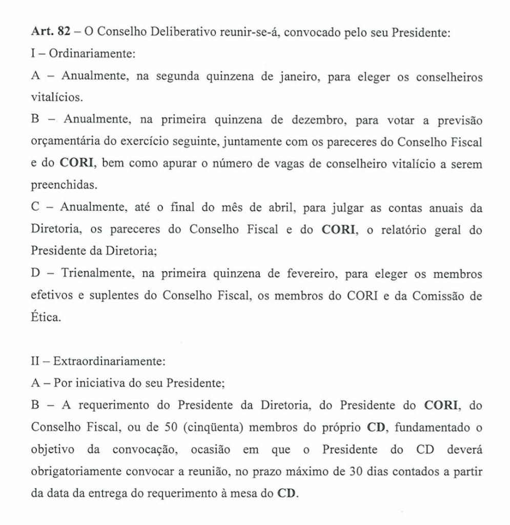 O artigo 82 do Estatuto estabelece que o Conselho Deliberativo deve ser convocado pelo seu presidente, ainda que a reunião seja solicitada por outras autoridades do clube, como o presidente da diretoria, o presidente do CORI, o Conselho Fiscal ou ao menos 50 conselheiros. Nesses casos, a norma determina que o presidente do CD tem prazo de até 30 dias para efetuar a convocação após receber o requerimento formal.