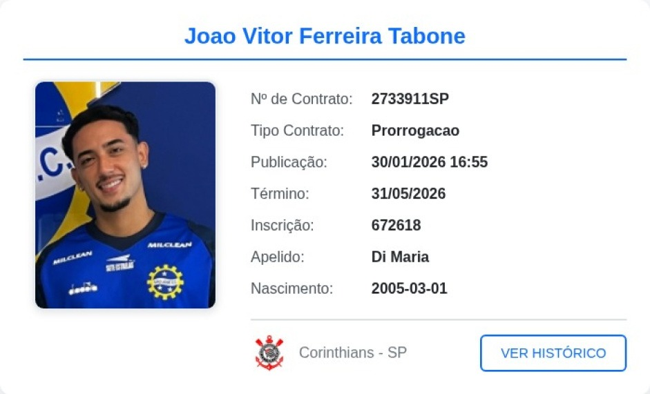 Ao longo da tarde desta sexta-feira (30), o Corinthians registrou, no Boletim Informativo Diário (BID) da CBF, a renovação de contrato do lateral-esquerdo João Vitor Tabone (2005), que pertence ao Sub-20 e está emprestado ao São José, clube do interior de São Paulo, até o final do seu vínculo com o clube do Parque São Jorge.