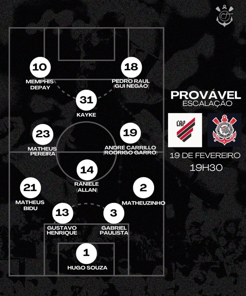 Desta maneira, o Corinthians deve iniciar o jogo com a seguinte formação: Hugo Souza; Matheuzinho, Gabriel Paulista, Gustavo Henrique e Matheus Bidu; Raniele (Allan), Matheus Pereira e André Carrillo (Rodrigo Garro); Kayke, Memphis Depay e Pedro Raul (Gui Negão).