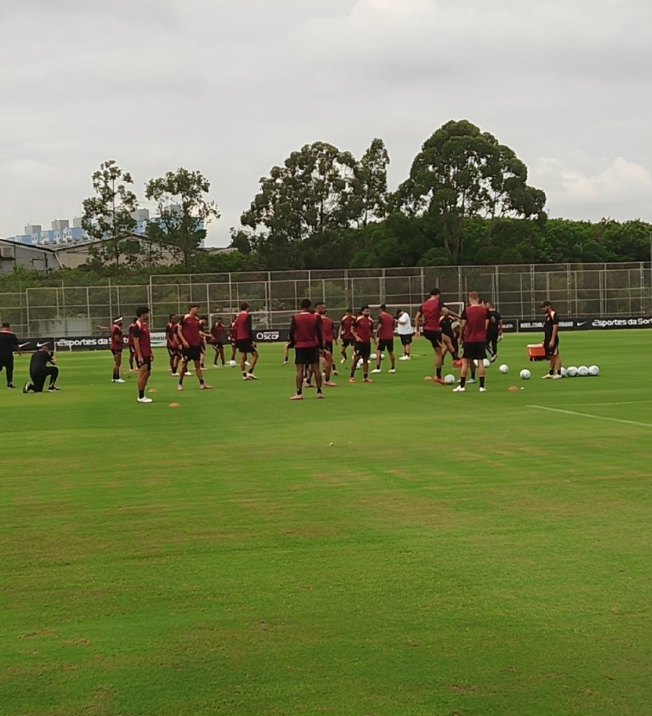 Por outro lado, três nomes foram ausência no treinamento. O meio-campista Matheus Pereira e os atacantes Kaio César e Yuri Alberto, todos em recuperação de lesões musculares na coxa, fizeram trabalhos na parte interna do CT e seguem como desfalques para Dorival Júnior.