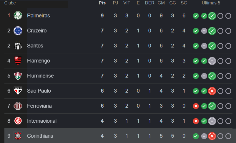 Com seis pontos aparecem o São Paulo e a Ferroviária, que se enfrentaram neste sábado. O time do interior paulista saiu vencedor do duelo, mas segue abaixo do clube do Morumbi na classificação por ter saldo de gols inferior. O Internacional fecha o G8 com quatro pontos, mesma pontuação do Corinthians, mas com vantagem no saldo de gols.