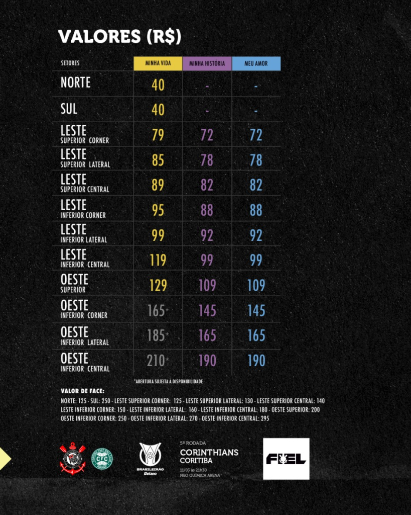 Na noite desta quinta-feira (5), inclusive, o clube do Parque São Jorge divulgou os detalhes da venda de ingressos para a partida. A comercialização ocorrerá somente no site do Fiel Torcedor, seguindo a dinâmica de prioridade dos sócios-torcedores com mais pontos no programa. Para poder comprar, vale lembrar, é necessário o cadastramento da biometria facial – seguindo a Lei Geral do Esporte para estádios com capacidade para mais de 20 mil pessoas.