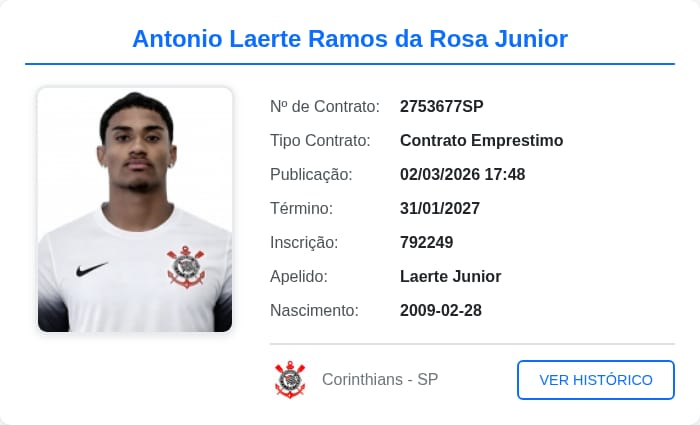 No final da tarde desta segunda-feira (2), o Corinthians registrou, no Boletim Informativo Diário (BID) da CBF, as contratações de dois atletas, nascidos em 2009, para a categoria Sub-17: o meio-campista Ji- Paraná, de 16 anos, e do atacante Laerte Júnior, de 17. Ao longo da Copinha 2026, com a camisa do União Cacoalense, de Rondônia, os dois tiveram desempenho que chamou atenção do Alvinegro.