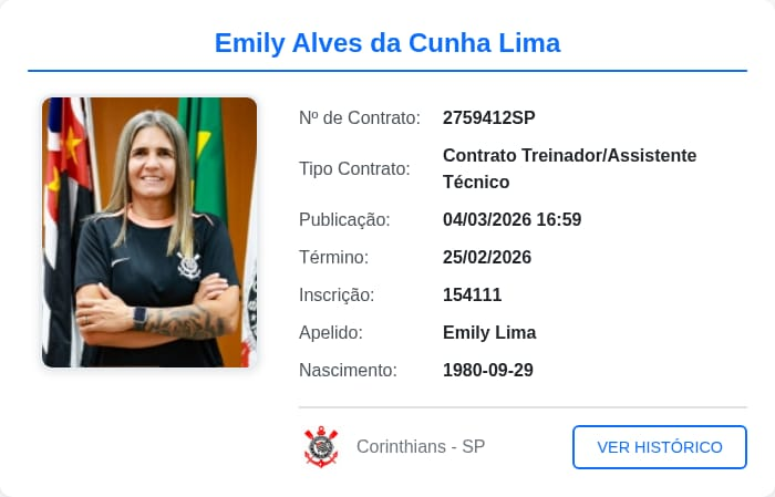 Ao longo da tarde desta quarta-feira (4), o Corinthians registrou o contrato da técnica Emily Lima no Boletim Informativo Diário (BID) da CBF. Desta maneira, ela, que chegou para substituir Lucas Piccinato – ficou dois anos no clube – , já pode estar na área técnica das Brabas. Seu anúncio ocorreu na última terça-feira (24), tendo sido apresentada dois dias depois (26), no CT Dr. Joaquim Grava.