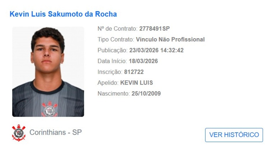 No início da tarde da última segunda-feira (23), o Corinthians registrou, no Boletim Informativo Diário (BID) da CBF, a contratação do goleiro Kevin Luís, de 16 anos. Nascido em 2009, o atleta estava na Ferroviária e assinou um contrato de formação até dezembro de 2027. Anteriormente, o Timãozinho já havia adquirido três atletas para a categoria: os meio-campistas Ji-Paraná e Victor Michell, além do atacante Laerte, que se destacaram por Meia Noite (SP) e União Cacoalense (RO) na Copa São Paulo de Futebol Jr de 2026.