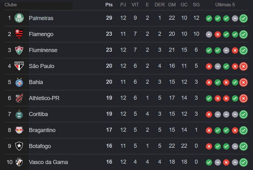 Na parte de cima, o Palmeiras lidera com folga, alcançando 29 pontos. Logo atrás vêm Flamengo e Fluminense, ambos com 23. São Paulo e Bahia, com 20 pontos cada, completam o grupo que, neste momento, garante vaga na Libertadores de 2027.