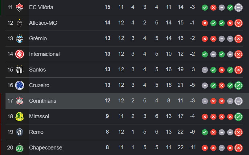 O encerramento da 12ª rodada do Campeonato Brasileiro, na noite de domingo, trouxe más notícias para o Corinthians. Após o empate por 0 a 0 diante do Vitória, no Barradão, e com a combinação dos demais resultados, a equipe paulista passou a integrar a zona de rebaixamento.