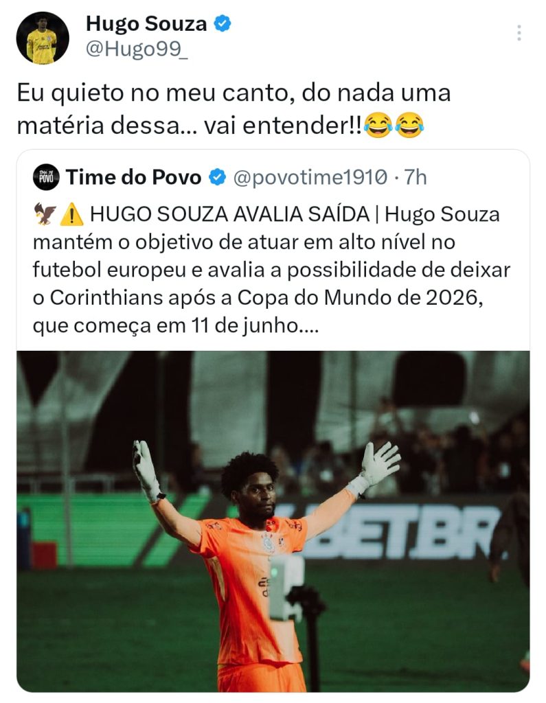 Na tarde desta terça-feira (3), o goleiro Hugo Souza utilizou as redes sociais para rebater a informação publicada pelo portal ge e reproduzida pela página Time do Povo de que estaria cogitando retornar à Europa após a disputa da Copa do Mundo, deixando o Corinthians rumo ao Velho Continente. Em tom irônico, o camisa 1 publicou: “Eu quieto no meu canto, do nada uma matéria dessa… vai entender!!”.