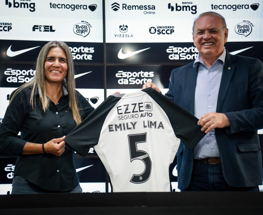 Na manhã desta quinta-feira (26), o Corinthians realizou a apresentação oficial da treinadora Emily Lima, nova comandante da equipe feminina. Após posar ao lado de Iris Sesso, diretora de futebol feminino, e Osmar Stabile, presidente do clube, a profissional de 45 anos revelou que já tinha conhecimento da realidade do Timão e elogiou o elenco que tem à disposição.